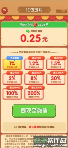 这款游戏与市面上多数赚钱小游戏的机制相似,提现初期会按照一定比例进行,初始比例为1%;随着通关数量增加,提现比例也会逐步提高,例如通过250关后,提现比例可达到100%。