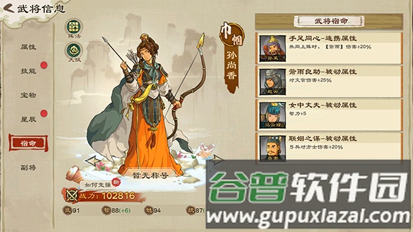 6、武将宿命;每位武将都有对应的宿命关联武将。解锁并激活宿命关系,能显著提升主将战斗力;部分合击技能需要特定武将同时上阵才能触发。