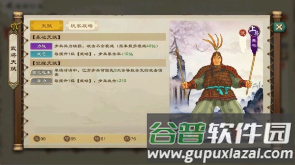 基础天赋“武艺”,每级“武略”提升步兵暴击率10%。