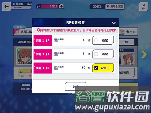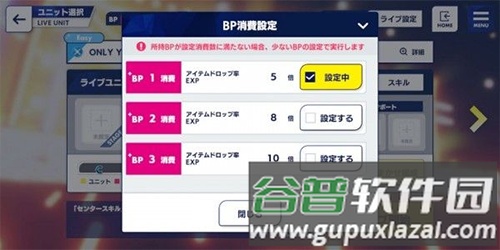 游戏中的体力值并非耗尽后无法进行演奏,而是用于提升单次演奏的资源获取效率;玩家可选择消耗不同数值的BP来增加道具掉落数量。因此在刷取特定素材时,合理运用BP尤为重要,特别是在某些具有道具掉落加成效果的歌曲中,配合高BP消耗能大幅提升收集速度。