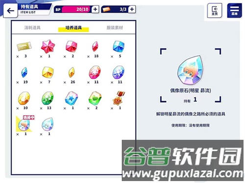 原石分为多个类别,包括通用的大中小矿石、对应卡片颜色的矿石、技能矿石、花朵勋章、MV矿石以及偶像专属宝石。偶像专属宝石用于解锁偶像之路上的服装、开花等项目,且每位偶像都需要其特定种类的原石来解锁技能,因此是极其重要的资源。接下来介绍具体获取方法。
