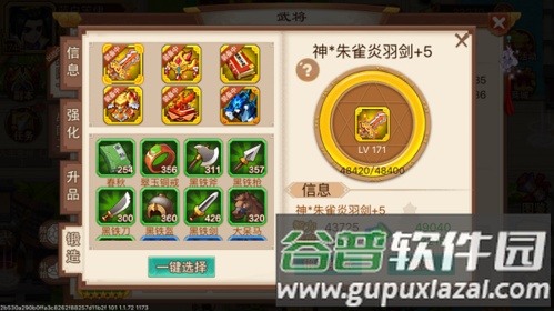 2、升品。使用特定材料提升装备品级,每次升品大幅提升属性。不同装备所需材料不同:白虎套装用白虎骨,朱雀套装用朱雀羽,兵书类用修书要诀,坐骑类用天山牧草,武器、铠甲、头盔、印信等则使用神兵炎铁。当前版本最高为金色五阶。紫色装备从0品升至+5依次需要20、40、80、120、160个材料,总计620个;达到紫色+5后,消耗200个材料可升华至金色品质。金色装备从0品升至+5依次需要50、100、200、300、400个材料,总计1050个。