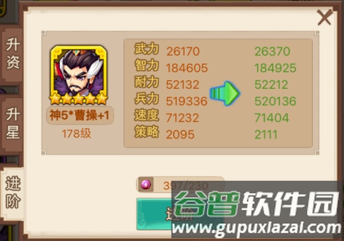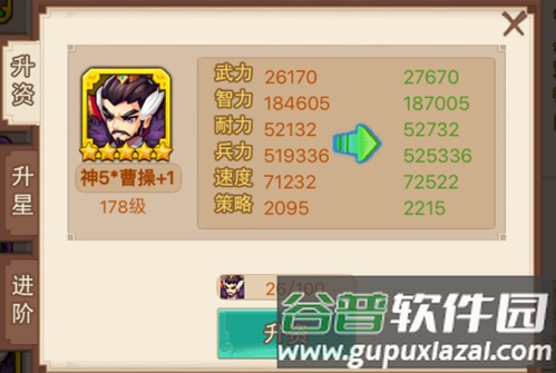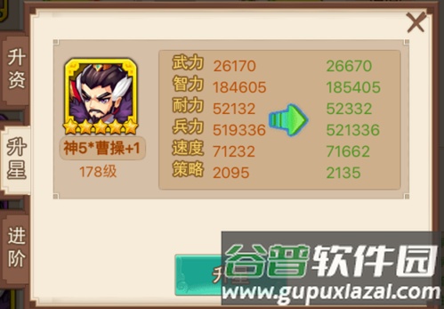 1、升资。使用武将升阶石提升武将资质,每次提升都会增加六维属性。紫色武将最高可至五阶,从+0升至+5依次需要20、40、80、120、160个升阶石,总计620个。资质达到+5后,消耗200个升阶石可进行品质升华,变为金色武将。金色武将从+0至+5依次需要50、100、200、300、400个升阶石,总计1050个。当前版本最高为金色+5。
