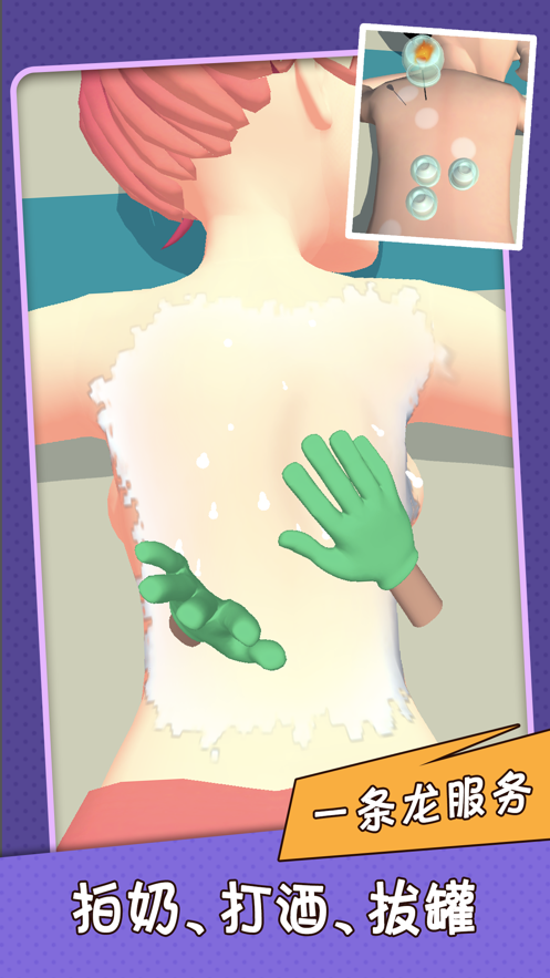 玩家在游戏里主要负责洗浴相关任务。 你可以试着操作搓泥服务。 游戏还包括挤痘和拔火罐这些小细节。 红酒浴或牛奶浴选项让体验更丰富。 针灸和采耳玩法能带来不同的反馈。 每种操作都让角色有生动反应。