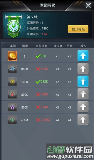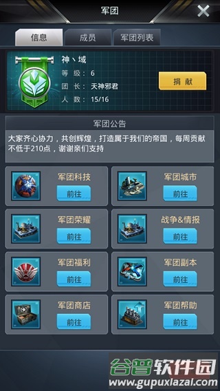 军团主等级制约着成员上限、科技等级、商店货物及帮助次数等关键要素;提升主要依靠成员捐献,资源捐献梯度为:10K、100K、800K、6.4M;元宝捐献固定为每次5元宝;发展初期建议每种资源捐献至100K档位即可。