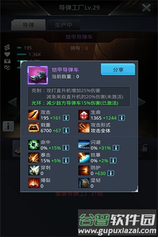 导弹车特点:对直升机伤害提升25%,受到导弹车伤害降低20%,自身携带暴击属性。