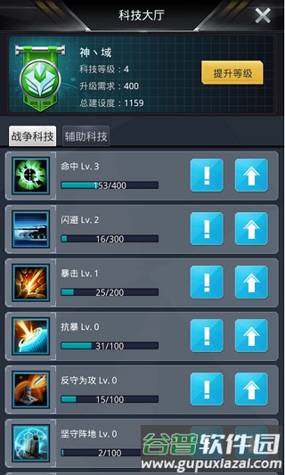 分为战争科技与辅助科技;战争科技提升部队暴击、伤害、减伤、闪避等属性,建议军团初期集中资源优先升级一项,如闪避;辅助科技增加资源产出、战斗经验、负载及仓储容量,其中战斗经验与负载的性价比更为突出。