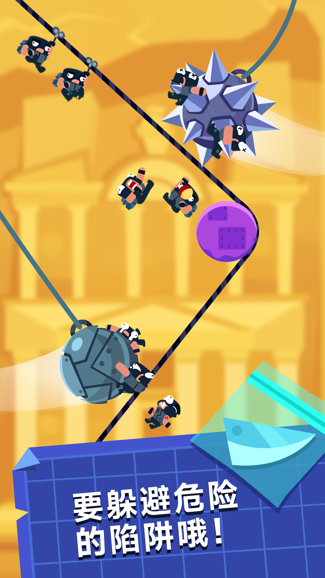 玩家要引导这些强盗借助绳子飞越障碍,顺利逃脱,这叫绳索逃生玩法。