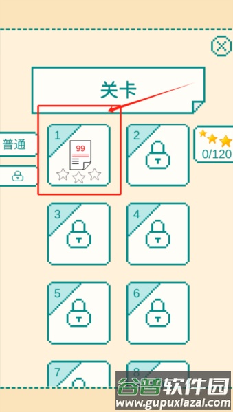 2、在关卡界面点击数字1进入第一关,左侧可查看普通模式及锁定关卡的状态。