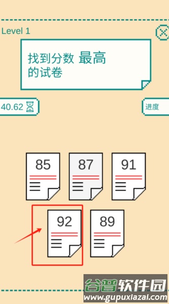 3、根据沙漏40秒倒计时,从五张试卷中找出分数最高的92分试卷。