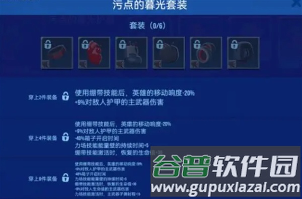 污点专属暮光套装在集齐六件后触发套装效果,增加射程与伤害,并附带生命恢复。