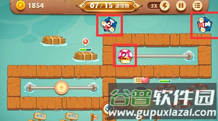 1. 如图所示,首先在位置1的红框处建造玩具飞机,控制其攻击同一条线上的障碍物。获得金钱后,立即在位置2建造蘑菇以减缓怪物速度。再有资金时,在位置3建造第二架玩具飞机辅助输出。如此布局可支撑到第7波。