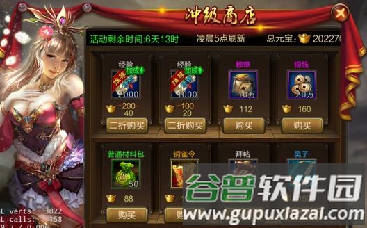 创建角色后的前七天,每日都会开放冲级商店;商店内不仅出售铜钱粮草等资源,还能以超低价格购买两份经验值,助力角色快速成长。