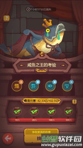 每日咸王挑战;伤害越高,奖励越丰厚;拥有赤羽后,对战BOSS的伤害会有明显提升,从而获得更多奖励。