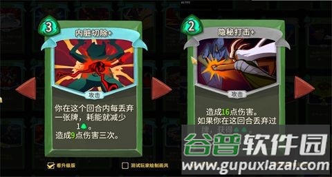 内脏切除:3费造成9点伤害3次,每弃一张牌减少1费;隐秘打击:2费造成16点伤害,若本回合已弃牌则回复2点能量。在大量弃牌支持下,这些攻击可趋于零费输出。