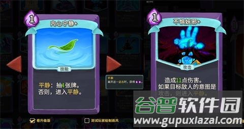 内心宁静:1费进入平静;不惧妖邪:1费造成11点伤害,若敌人意图攻击则进入平静。