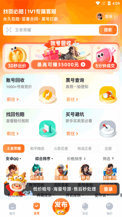 热门游戏齐全,市面主流热门游戏(王者、吃鸡、火影等)的高端账号都有上架出租;