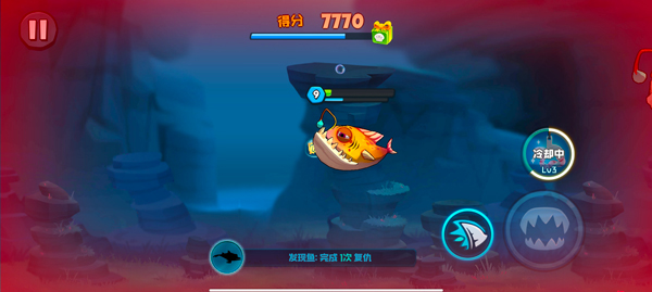 3、游动过程中如果撞到比自己体型大的鱼,就会扣除对应的生命值,生命值全部扣完的话本局游戏就会结束;