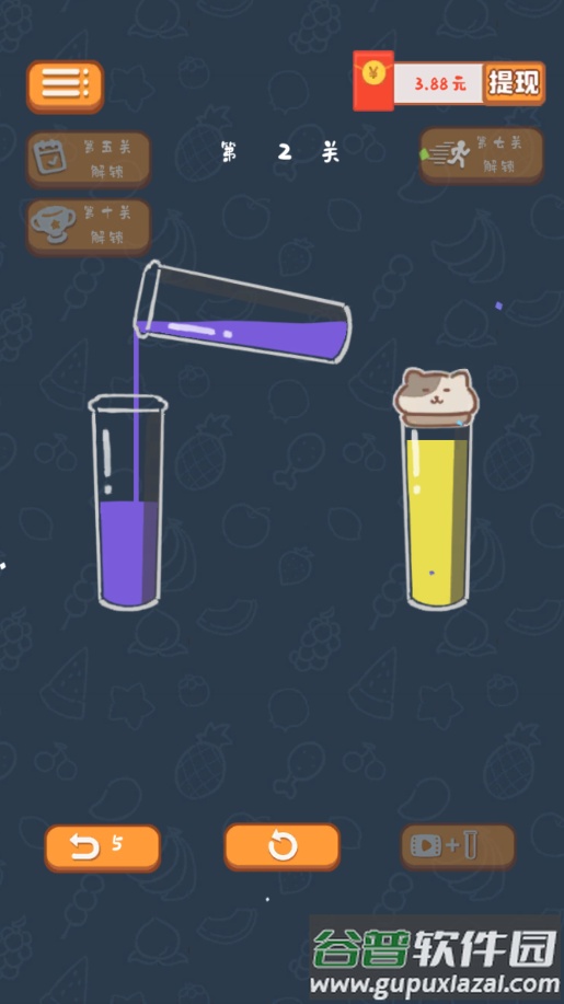 1、游戏内置了贴心提示功能,遇到卡关的情况可以使用,快速找到匹配的同色液体;