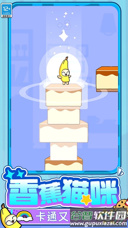 1、角色采用香蕉猫等可爱形象设计,动作俏皮生动,配合梦幻色彩的游戏场景,营造出轻松欢快的视觉氛围;