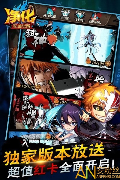净化手游是还原度拉满、收录角色十分全面的死神主题BT版本手游,上线就享有1:500的超值充值比例,创建角色就能直接领取超人气死神主角黑崎一护以及海量钻石福利。黑崎一护、朽木露琪亚、日番谷冬狮郎等超人气角色全部上线,护庭十三队、十刃、破面、星十字骑士团所有角色都可以自由养成。延续死神IP的经典设定,守护尸魂界的荣耀,超爽快的BT专属福利,带你重燃当年的bleach热血。