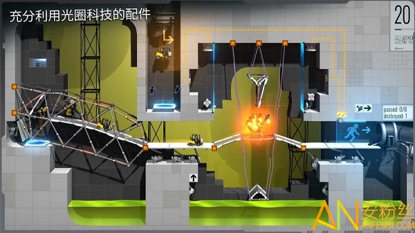 桥梁建筑师传送门是物理益智类游戏,你将以光圈科技测试实验室新员工的身份上岗,要在60个测试室里搭建桥梁、斜坡、滑梯和其他各类建筑,让班迪坐在车辆里安全抵达终点线。你可以灵活使用游戏里的多种小工具,比如传送门、动力凝胶、排斥凝胶、光圈弹射板、方块等绕开岗哨炮塔、酸水池和激光障碍物,解开开关相关的谜题,全程不受损伤通过测试室。