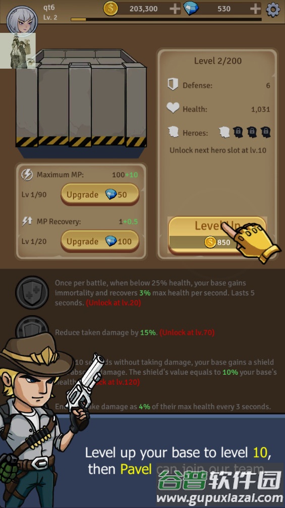 10.后续解锁新英雄帕维尔的时候,需要先将基地升级到对应等级解锁新的角色槽位;