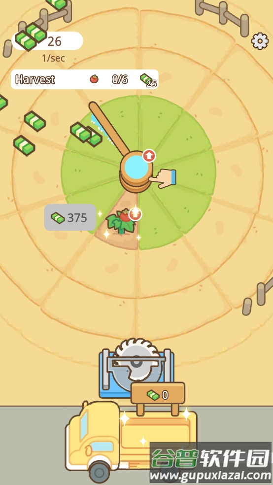 持续采收成熟作物可以获得大量金币,金币可用来购买升级项目,包括提升洒水设备运转速度、扩大农场可耕作面积等;