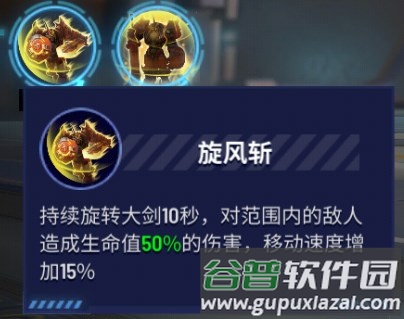 旋风斩:持续旋转大剑攻击周围敌人,持续10秒,造成50%伤害并提升移动速度。