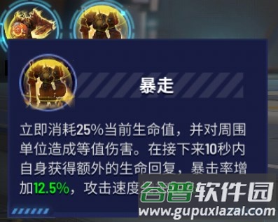 暴走:消耗当前生命值的25%对周围造成等额伤害,随后10秒内获得额外生命回复与暴击率提升。
